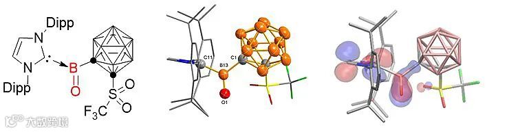 化合物3的晶体结构显示笼外硼原子采用sp2杂化方式,呈现平面三角形的几何构型,笼外硼原子分别与一个氧、一个碳硼烷的碳和一个卡宾碳相连。值得指出的是,化合物3中硼氧双键距离为1.256(3) Å,是迄今为止所有报道中最短的硼氧双键(1.273(8)-1.329(6) Å)。作者通过DFT计算进一步阐述了该化合物的电子结构并对它的反应性质进行了研究,结果表明硼氧双键 π 键可以在 HOMO-6 中观察到(图2)。