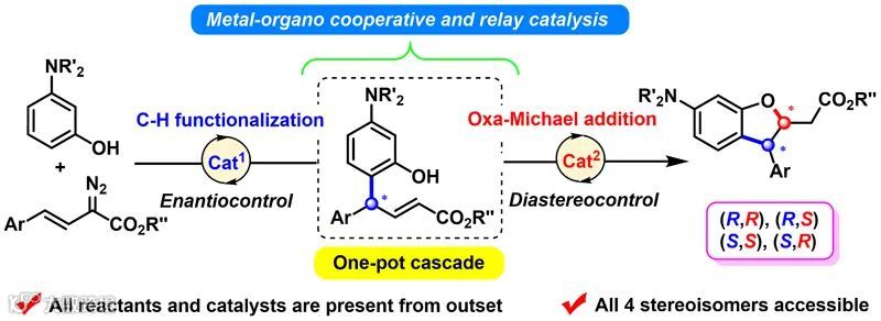 南方科技大学徐明华课题组长期致力于手性烯烃配体及不对称催化反应研究,近年来利用C1-对称的手性双烯为配体,在一价铑卡宾介导的不对称B-H,Si-H插入以及C-H官能团化领域取得了一系列进展(J. Am. Chem. Soc., 2015, 137, 5268; J. Am. Chem. Soc., 2016, 138, 1498; J. Am. Chem. Soc., 2021. 143. 2608; Chin. J. Chem., 2021, 39, 1911)。近日,他们在前期C(SP2)-H官能团化工作的基础上,巧妙地利用产物中的O-H以及反应过程中生成的α,β-不饱和酯结构,串联分子内oxa-Michael反应,通过金属和有机两类手性催化剂协同的接力催化策略,实现了手性2,3-二取代苯并二氢呋喃的立体发散性合成。利用两个催化剂的合理组合,可以以“一锅法”高效高选择性地合成四个立体异构体中的任意一个,该工作近期发表于J. Am. Chem. Soc.。