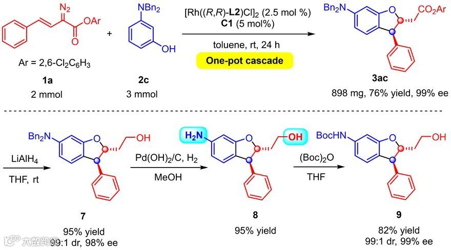 为了考察方法的实用性和高效性,作者将反应的规模提高到克级,发现依然可以得到同样的对映和非对映选择性结果,以3ac为例(图5),获得99:1 dr,99% ee,将酯基还原,脱去N-苄基后可以得到一类结构特殊的氨基醇化合物,有望作为新型分子骨架用于药物研发。