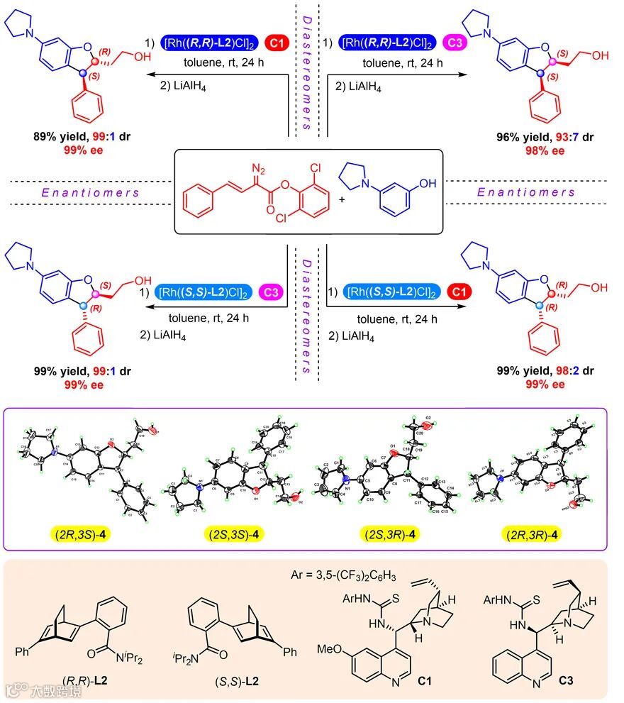 首先,作者尝试了三乙胺作为有机碱的一锅串联反应来研究两个手性中心的立体控制。对于第一步铑(I)-催化的C-H官能团化反应,基于前期研究工作基础,进一步筛选了手性双烯配体,发现C1-对称的苯环上邻位含酰胺基团的手性双烯为配体时,反应可以取得更好的对映选择性。接下来需要实现第二步oxa-Michael加成反应的立体选择性控制,作者仔细考察了一系列金鸡纳生物碱类有机小分子催化剂。研究最终发现奎宁衍生的硫脲催化剂不仅可以很好地与铑(I)金属催化剂共存,同时能够高效催化酚羟基对反应活性较弱的α,β-不饱和酯的不对称加成,给出非常优异的反式产物的结果;而辛可宁衍生的硫脲催化剂则可以取得最优的顺式产物的结果。基于以上两个结果,利用不同构型的铑(I)/双烯配合物催化剂和奎宁或辛可宁衍生的硫脲催化剂组合,反应可以以“一锅法”方便地得到含两个手性中心的2,3-二取代苯并二氢呋喃化合物的全部四种立体异构体,所有产物的绝对构型都通过X-ray单晶衍射得到确认(图2)。