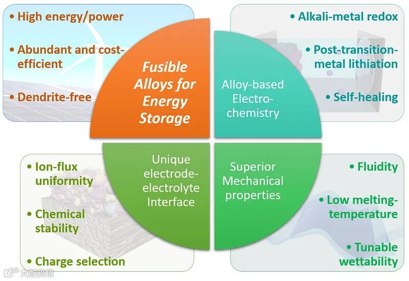 图1. 低熔点合金的主要材料性质与在储能领域的应用优势。