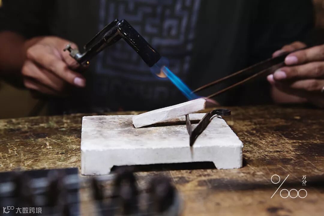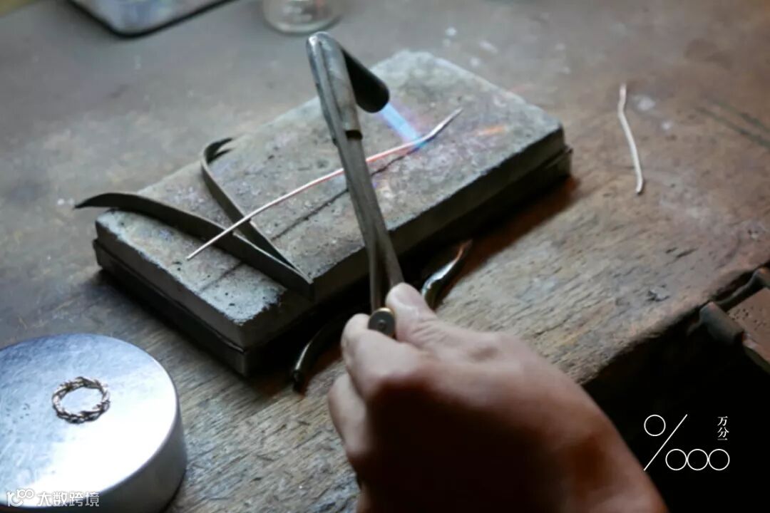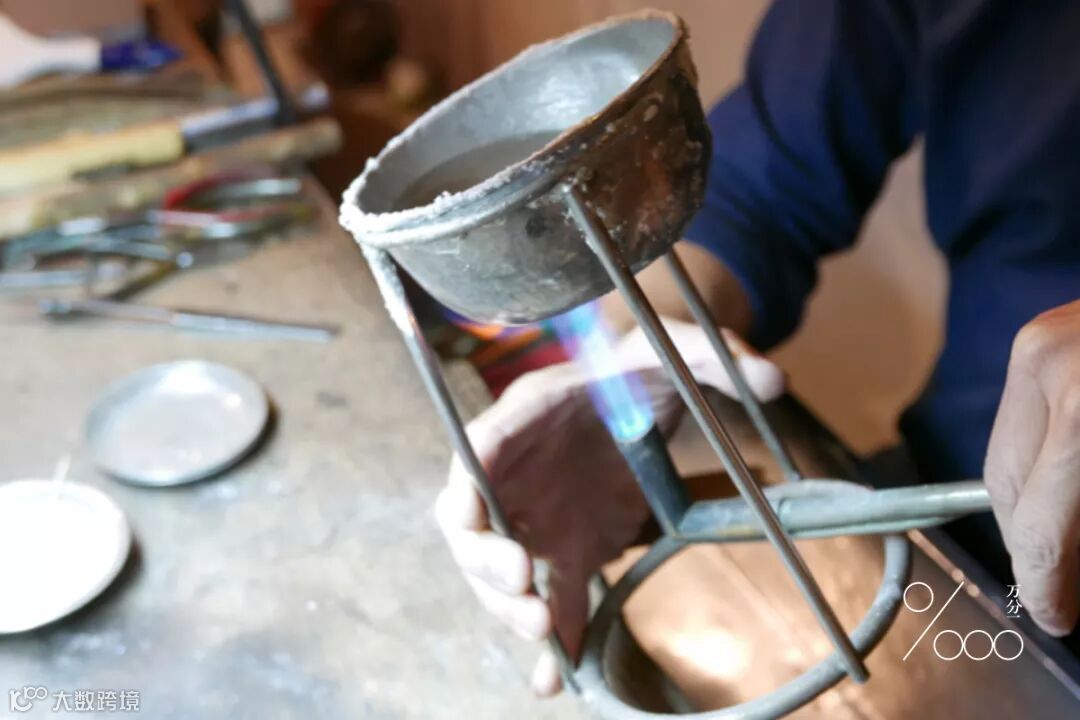 ▲使用火枪将银线烧软(下方为耐火砖)