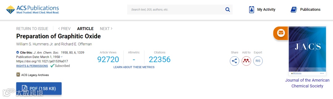 氧化石墨可以转换为氧化石墨烯,后者因其良好的分散性成为制备石墨烯的一条重要思路。考虑到这篇文章与材料科学领域的“超级明星”石墨烯存在关联,其阐述内容涉及重要原材料的制备方法学,因此有如此高的引用就不足为奇了。
