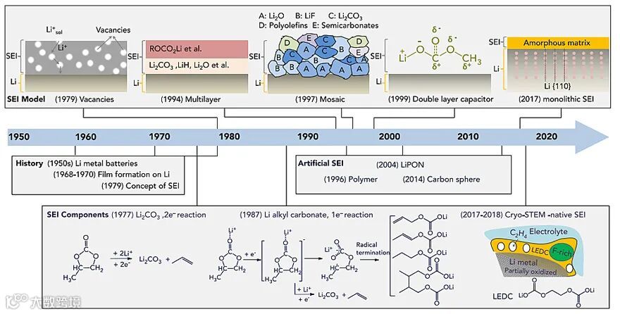 第一次锂金属电池的研究至少可以追溯到20世纪50年代,当时的目标是制造具有更高能量密度的电池;在20世纪60-70年代,研究人员开始认识到在金属锂表面形成了一层固态膜,保证了即使Li+/Li具有最负的电化学电势,仍能在非质子型电解液中稳定工作;这层固态膜在1979年被Peled定义为SEI。之后,各种各样的SEI模型被推测和建立,同时,SEI的组分也逐渐被理解,各种人工SEI也根据不同的需求而设计合成。