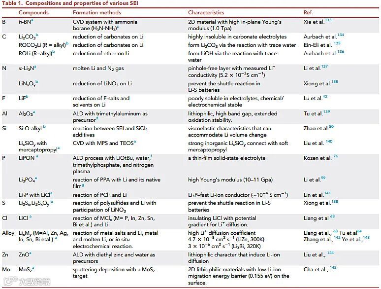 目前SEI有多种制备方法,利用电解液改性可以构建内置SEI、利用锂的化学反应活性可以制备人工SEI。化学气相沉积(CVD)、原子层沉积(ALD)和溅射等薄膜技术被广泛用于合成人工SEI,除了表1中列出的化合物外,还有大量关于聚合物/杂化SEI的报道。