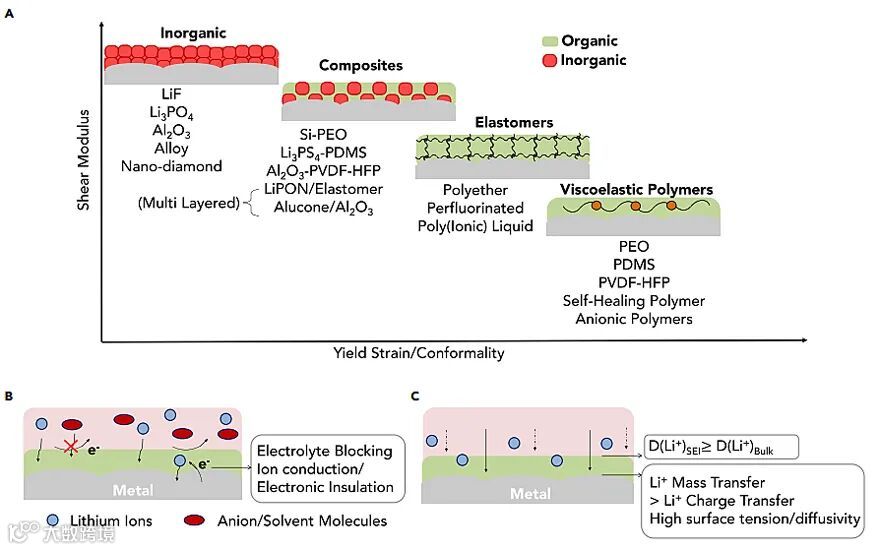 人工SEI(ASEI)是另一个有吸引力的解决方案,可以克服内置电解液形成界面的缺点。由于SEI是在电池外部创建的,界面相的性质和组成可以通过许多方法精确调整,以控制电沉积金属的形态。SEI的机械稳定性是实现均匀沉积的关键参数。通常考虑两个因素,剪切模量和屈服点。同时人工SEI要具有化学稳定性,能够阻止所有除金属还原反应之外的法拉第和非法拉第反应,并且提供稳定均匀的锂离子输运,在ASEI内部具有高的锂离子扩散率,在电极/ASEI界面,提供较高的表面扩散率。