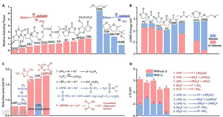 相对溶剂化力,定义为测试溶剂与参考溶剂的配位百分率,比介电常数或给体数更能定量地捕捉电解液与金属锂的反应能力,较高的相对溶剂化能力能够使更多的锂溶剂化,这将有利于它们在电场作用下转移到锂金属表面,使它们更容易被还原。电解液的LUMO能级也反应了在锂金属表面的还原能力,同时在实际应用中要注意到溶剂的LUMO能级很容易受到盐的影响,清华大学张强老师团队在这方面有很多出色研究。盐也可能在锂电极上被还原,通过测试相同的溶剂并且不同的盐组成的电解液的稳定性,结果表明电化学还原电位随盐的不同而明显不同。同时,在锂金属电极表面形成的其他活性物质也会影响盐的分解动力学。