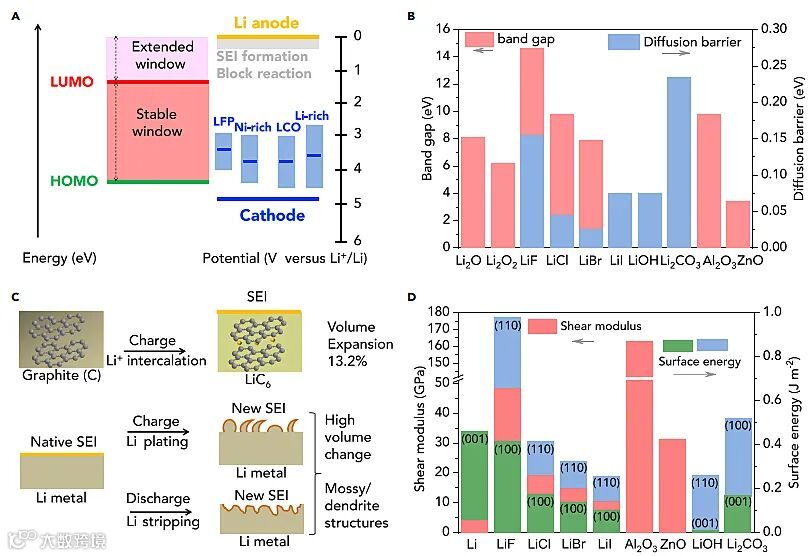 由于电解液的LUMO能极低于锂金属,因此一般电解液在与金属接触时,会在表面生成SEI膜,从而拓宽电解液的操作窗口。SEI应该是电子绝缘的,从而延缓锂和电解液之间的进一步反应,因此具有高带隙的组分是SEI的首选。同时,SEI应该具有快速导离子的能力,一旦溶剂化的锂离子在外加电场下转移到SEI表面,SEI可以对锂离子进行脱溶剂化,并将裸露的锂离子转移到负极。在这里,具有低扩散活化能的SEI是更为合适的选择。锂离子插入石墨负极并形成LiC6只会引起较小的体积膨胀(~13.2%),相比之下,锂金属剥离/电镀过程没有宿主,经历非常大的体积变化。因此,SEI中产生的应力是显著的,同时锂金属倾向于以非平面的枝晶状形貌沉积,增加了其他力学要求。Monroe和Newman的理论表明,当与金属镀层接触的材料的剪切模量大约是金属锂的两倍(4.2 GPa)时,可以抑制不均匀的锂沉积。同时,通常由具有高界面能界面产生的高表面张力,也可以稳定金属沉积过程。