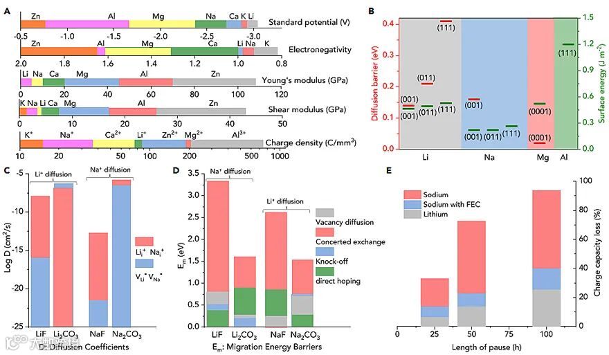 除金属锂之外,近年来钠、钾、镁、钙、锌、铝等金属电池的发展也受到越来越多的关注。物理化学性能和表面信息的变化对这些金属中设计SEI提出了不同的策略。总的来说,钠和钾与锂有着相似的物理化学性质,但表现出更低的电负性,SEI组分也具有不同的溶解度和模量。钠和钾的硬度等比金属锂更软,说明物理手段更容易抑制枝晶生长。作为比较,多价金属(镁、钙、锌和铝)的模量更高,枝晶的生长更加危险。更糟糕的是,多价离子较高的电荷密度通常导致SEI中的离子迁移率较低,增加了SEI设计的难度。计算表明,镁的扩散势垒比锂和钠都低,因此Mg有在平滑结构中生长的趋势。钠与锂虽有很多相似之处,但形成的SEI却有些不同。理论上,由于钠离子的极性较低,大部分钠SEI比锂SEI更容易溶解,因而钠金属在静置过程中的容量损失较大,钠在电解液中的溶出/电镀效率一般低于锂离子,特别是在碳酸酯类电解液中。最近的工作表明,在金属钠上建立一个稳定的锂SEI是保护金属钠的有效方法,这为设计异相SEI提供了思路。