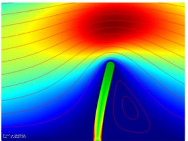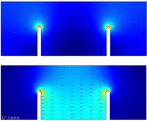 在电极表面的自由电子密度分布显示为云图分布,探针简短出现钾离子及电流富集现象。