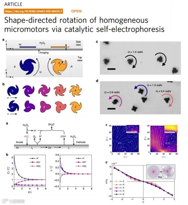 这篇文章研究了一种化学能驱动的微型驱动器。金属Pt被微加工成特定的形状放入H2O2 溶液中,通过分解H2O2产生氧气金属薄片产生自发的旋转。并且旋转的方向和速度完全可以通过设计金属薄片的几何形状来得到调控。对于这种微型驱动器的研究其实已经很多了,作者重点是提出了一种全新的推进机制来解释这种自驱动行为。这种机制被定义为自电泳驱动机制(Self-electrophoretic propulsion mechanism),其原因可能是,在铂片表面上,不同部位以不同速率发生着过氧化氢的阳极氧化和阴极还原现象。他们通过复杂的理论分析,建立了一个理论模型来解释这种形貌调控自驱动动力学的现象,并用他们解释了一系列的实验现象。