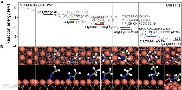 在保护产物乙胺方面的作用,作者借助密度泛函理论DFT对反应历程进行了研究。如图5所示,乙腈在Cu(111)晶面上的吸附通过氰基C≡N末端N原子与表面Cu原子键合,加氢过程以质子耦合-电子转移机理逐步在N、C位点进行,中间未有C