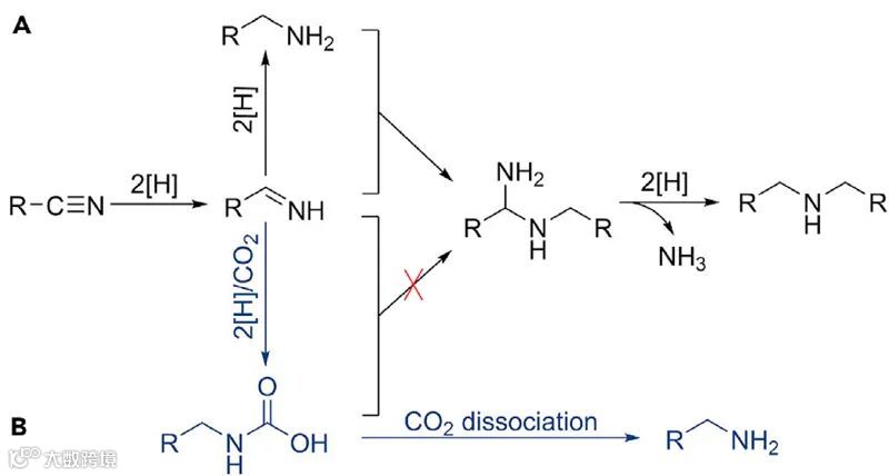 图4. 腈加氢合成伯胺的基本历程。