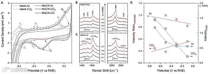 机理研究中,作者利用电沉积法制备了不同粒径的金属铜粒子,将之与还原氧化铜的催化性能进行了比较,发现二者对乙腈加氢反应的催化活性无显著差别,确认催化活性位点更应为金属态铜。进一步地,结合电化学循环伏安测试和原位Raman光谱表征发现,较Ar饱和时,C
