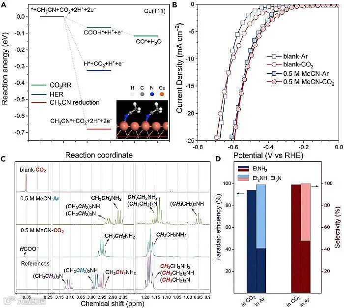 饱和的电解液中的产物仅为乙胺。定量分析表明,乙胺在液相产物中的选择性可达99%,总的电流效率为94%,而Ar饱和时产物为乙胺、二乙胺和三乙胺的混合物(图2)。对比反应条件(还原电位、底物浓度、催化剂种类、溶解气氛等)后确认,伯胺的高选择性生成与Cu催化剂和溶解C