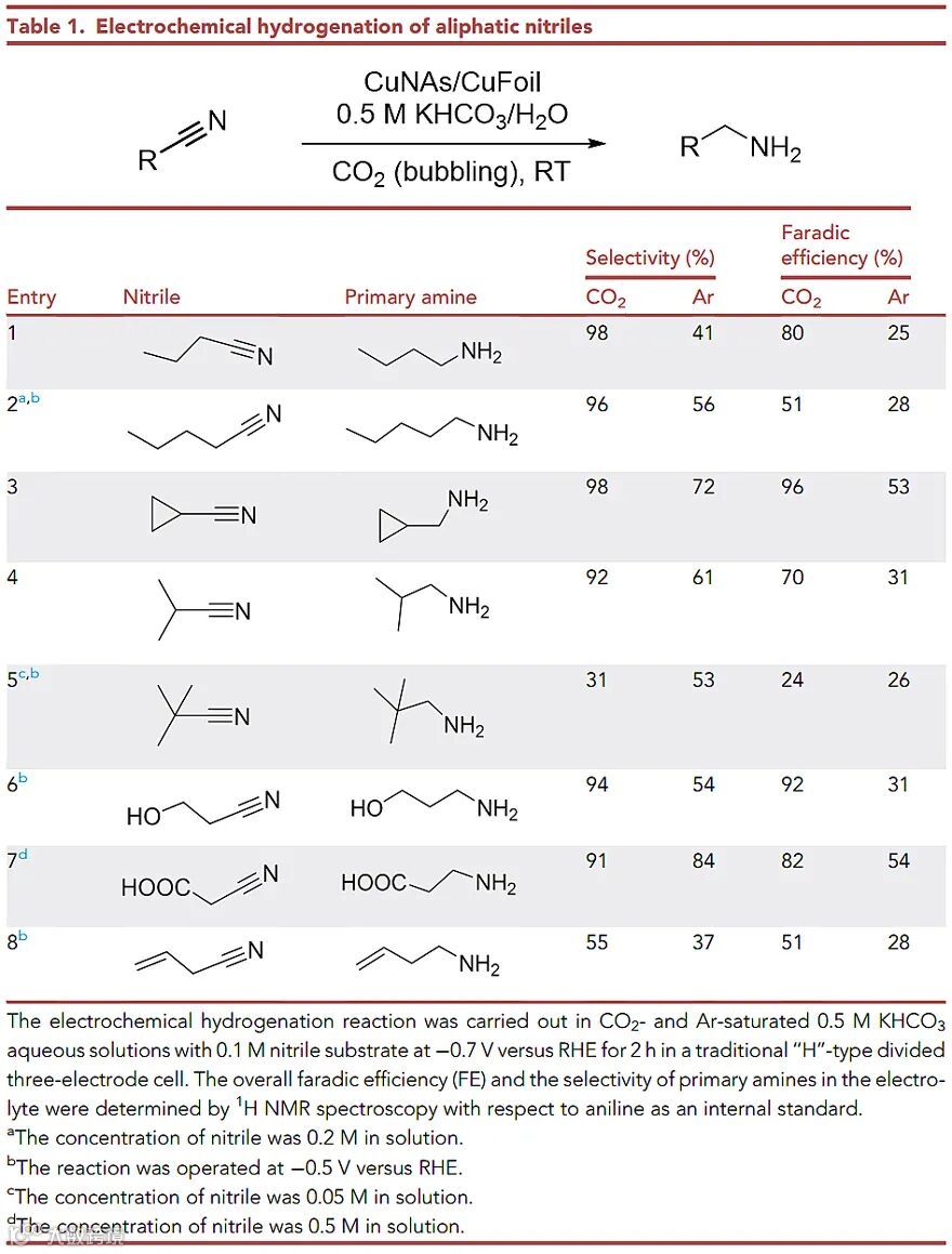 基于对乙腈电催化加氢选择性制乙胺反应历程的理解,作者将该方法扩展到了其他含氰基C≡N官能团的脂肪腈底物体系,以评估该方法在伯胺合成中的通用性,相关结果如表1所示。可以发现,C