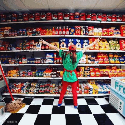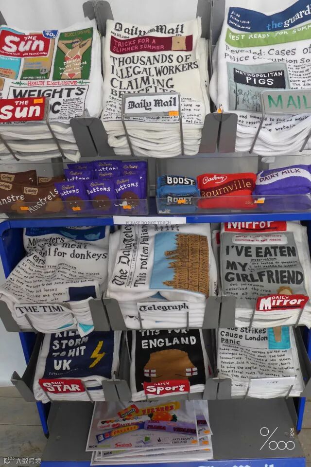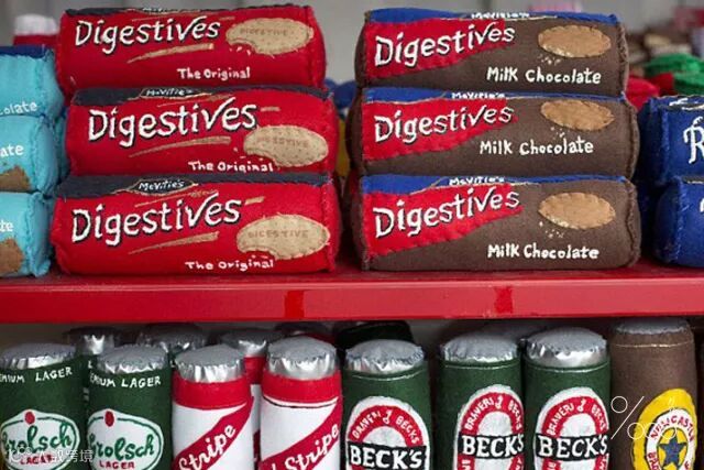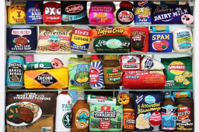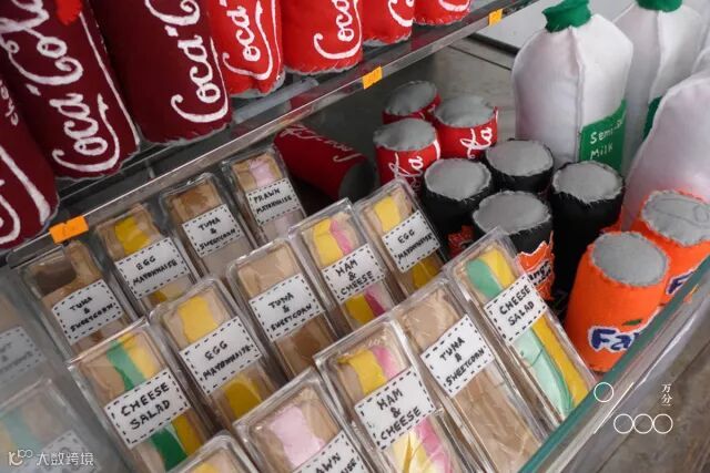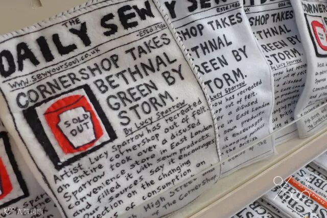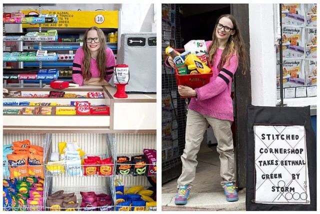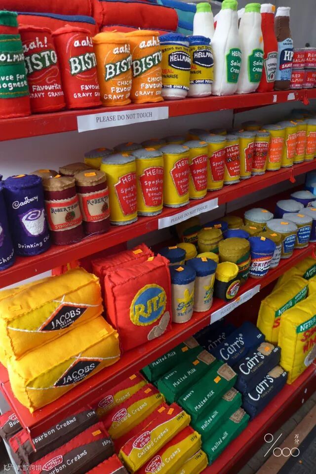 艺术家Lucy Sparrow耗时超过7个月,缝了超过25万针,共制成了店内近4000件商品。店内的陈列架上摆了满满的商品,从地板堆到天花板,从早餐的麦片、放满肉品的熟食柜,到冷冻食品、汽水等饮料,应有尽有。