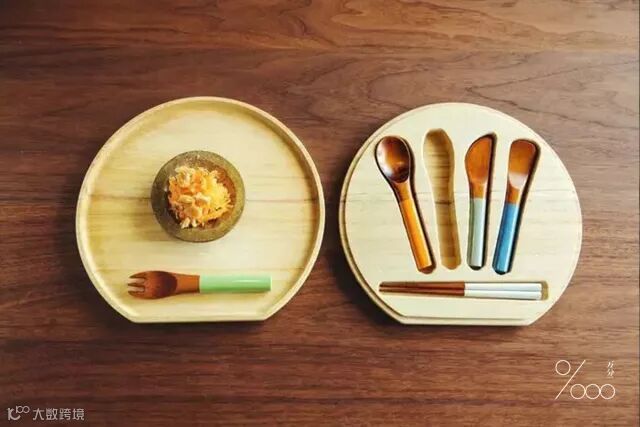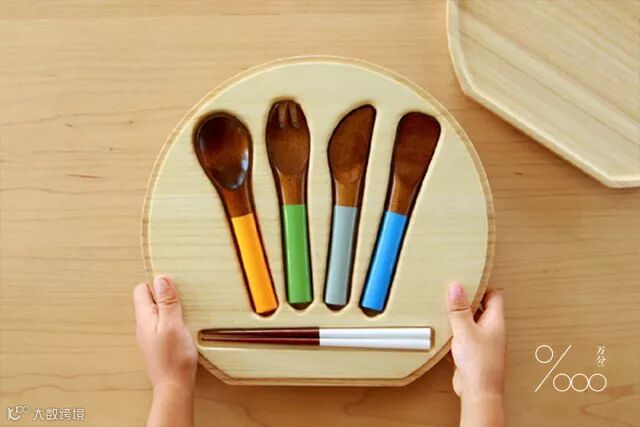 ▲这套获奖餐具包括木制铲叉,汤匙和筷子,统一放置在一个模具木盒子里,盒盖还可以作为托盘使用。 汤匙、筷子的手把部分都是采用彩色亮丽的漆制作而成,接触食物的部份是木器。