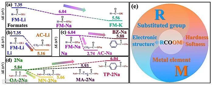 。通过理论和实验两方面阐明了在此技术中金属羧酸盐添加剂的电化学氧化电势由氧-金属键的成键能决定,且进一步能被取代基团的电子结构和金属元素的软硬度所调控。