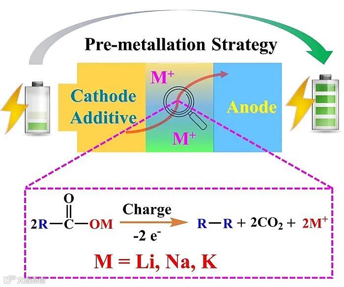 预金属化,即预嵌入金属离子,被认为是为电化学储能体系中额外提供充足金属源的一种技术。预金属化在电化学储能体系中有着重要的作用,不仅能够有效地为金属离子电池补偿初始容量的损失,还可以增大混合离子电容器的工作电压并减少电解液的消耗。此外,预金属化的处理能够解决高活性碱金属带来的安全问题,能极大地加速电化学储能体系商业化的发展。目前,各种各样的预金属方法已经被报到并用于高性能电化学储能体系的构筑。值得注意的是,当前所报道大多数有效的预金属化方法都需要在极端的惰性条件中实施,操作繁琐且复杂。此外,预金属化技术缺少理论和实验方面的指导且预金属化程度难以准确把握。更重要的是,引入牺牲型正极添加剂被认为是一种能实现原位预金属过程十分实用的策略,然而正极添加剂分解电势的精准调控仍然是一个棘手的挑战性难题,不利于预金属化技术的发展。