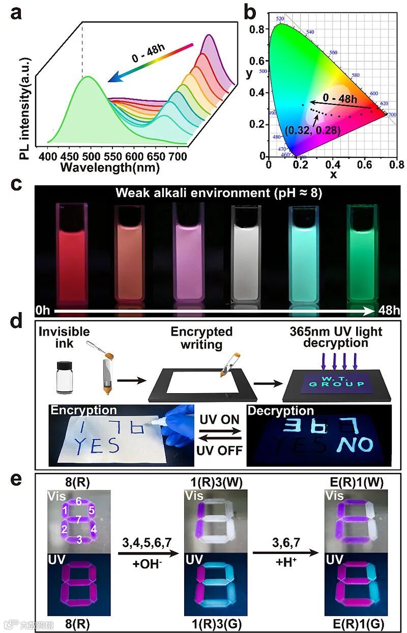 为了扩展该荧光体系的应用范围,该研究团队通过在胶束表面包覆硅烷壳层的方式,来防止胶束结构的破坏和染料的泄漏,增强了体系的稳定性。该荧光体系可以实现包括白光发射在内的一系列荧光颜色的变化,同时还可以作为一种新型的“隐形墨水”,在纸和水凝胶等载体上实现信息的加密和解密。