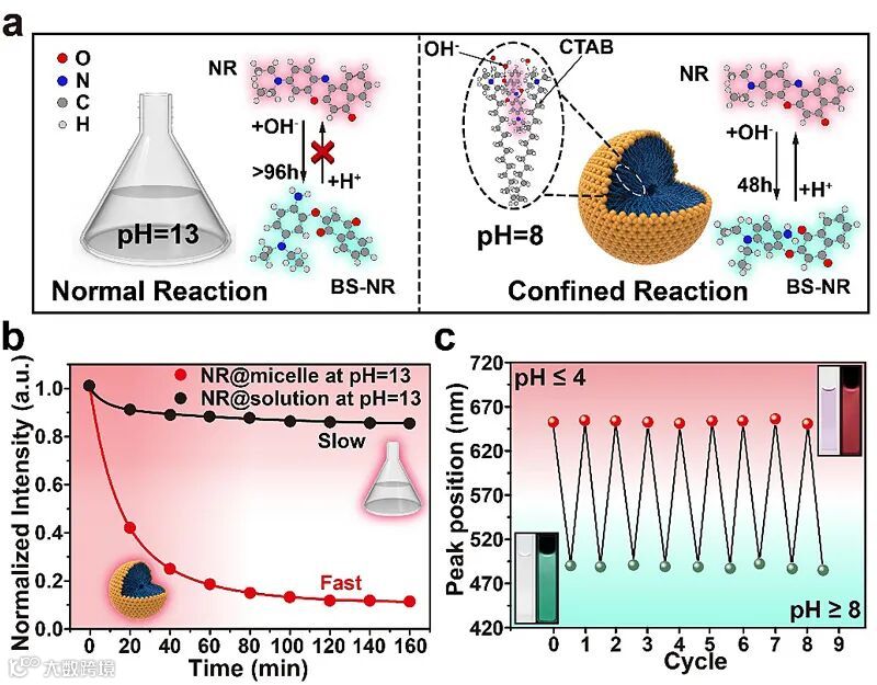 浓度,使C=N在弱碱性条件下即可断裂,降低了分子的共轭程度,实现荧光蓝移;另一方面,该体系还可以限制分子的自由转动以降低反应官能团之间的空间位阻,使得C=N更易于重新生成,从而实现荧光的恢复。该团队还证明,胶束纳米空间限域效应具有一定的普适性,可以用于尼罗蓝、试卤灵等有类似结构的分子。