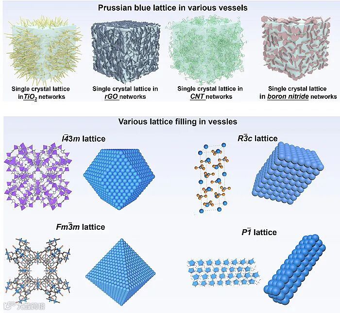 为了验证是否存在此规则,有必要发展一种方法,将多种单晶填充进入不同结构、组成以及表面性质的连通管道中,以便于系统研究单晶的填充外形。在此前的报道中,通过调控模板与晶体间的相互作用,可以获得一些单晶填充的例子。但是,“单晶与管道对”的选择非常有限。为了实现多种单晶点阵在不同连通空间的填充,华东师范大学物理与电子科学学院的胡鸣研究组提出了一种梯度场辅助的结晶方法,突破了“单晶与管道对”的限制,实现了多种单晶点阵的填充。单晶包括:普鲁士蓝、ZIF-67、HKUST-1、CaCO3等。连通网络包括:碳颗粒、碳纳米管、TiO2纳米线、石墨烯以及片状氮化硼等。在填充中,该小组证实存在一种点阵填充效应:(1)单晶点阵可以填充在不同结构、组成以及表面性质管道中;(2)不同通道内的单晶体的前沿位置,不受管道类型和性质的影响,反映出晶体本征的对称性。