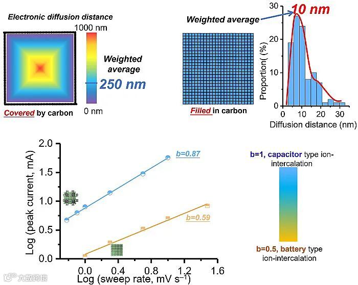图3. 内嵌3D导电碳网络普鲁士蓝单晶体的电子离子传输性质。