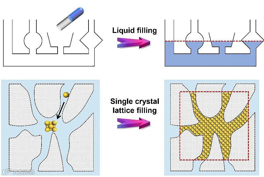 单晶体是长程有序的物质,是研究连通管填充的理想对象。然而,在实验上实现单晶体在连通管里的填充面临一些困难。原因在于晶体在管道内易出现多处成核与生长,形成纳米晶或多晶。已有的报道表明,单晶体可以内嵌非连续的异相杂质。这意味着连通管道中的单晶填充可能发生。通过精确调控结晶动力学,单晶被成功地生长在具有有序多孔结构的模板中。在这些例子中,单晶体可以占据多个管道。比较这些单晶的轮廓形状,可以将这些单晶体分为两类:一类的外观形貌与晶体对称性无关;另一类单晶体展现出受本征对称性支配的平衡外形。这些现象表明,单晶在三维连通管道填充时可能存在某个规则。这个规则可被概括为:在任意通道内的单晶体的前沿可由晶体的本征对称性决定。