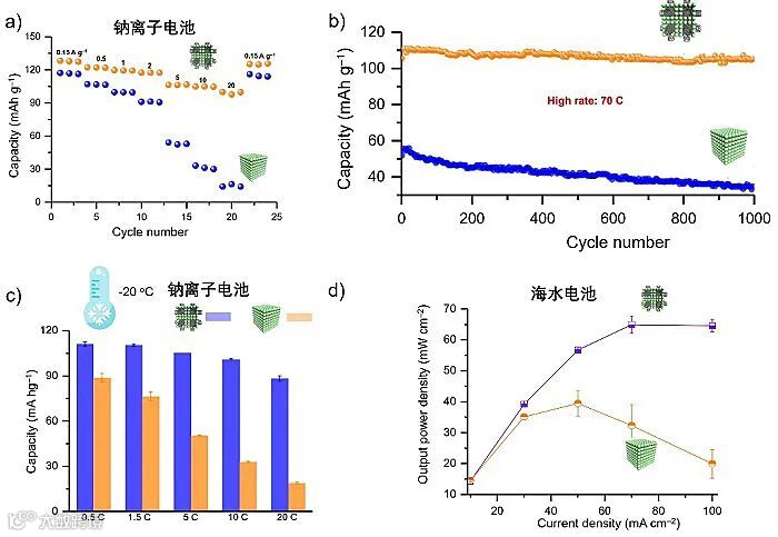图4. 填充单晶的电化学性质。(a)钠离子电池。(b)长循环性能。(c)低温钠电池性能。(d)低温海水电池性能。