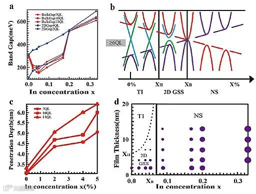 图1. (Bi1-xInx)2Se3(0≤x<1)薄膜能隙、表面态穿透深度的演化以及物态相图