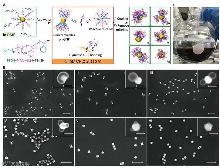 -PSt-SH)。将聚合物与金纳米颗粒直接混合在DMF溶液中,部分聚合物通过配体交换接枝到金纳米粒子表面,加入不同含量的不良溶剂水,经加热-冷却处理,即可制得均匀的、具有可控数目和形貌的聚合物补丁金纳米粒子。通过调整聚合物结构、链长、金纳米尺寸,以及水含量,可制备豌豆状、单斑块、双斑块、三斑块、多斑块(n > 3)以及开口构象的补丁纳米粒子(图1B)。实验和模拟计算揭示未接枝的双亲性聚合物自组装所形成的活性胶束可作为聚合物配体的“蓄水池”,它既可防止在热处理过程中金粒子表面聚合物配体的彻底脱落而影响粒子稳定性,亦可在降温过程中恰当地促进溶液中聚合物配体在聚合物斑块上的吸附和相分离形成结构对称的均匀补丁粒子。三嵌段聚合物中间随机嵌段(即,聚(苯乙烯-