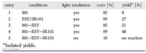为了更好地模拟自然界光合作用,M1-ESY-SR101体系被用于催化水溶液中苯基乙烯基砜和四氢呋喃的C-H键烷基化反应,与一步能量转移的M1-ESY体系或ESY/SR101体系相比,具有连续能量转移过程的光捕获系统大大缩短了反应时间、提高了转化率和产率,表现出更好的催化性能(表1)。