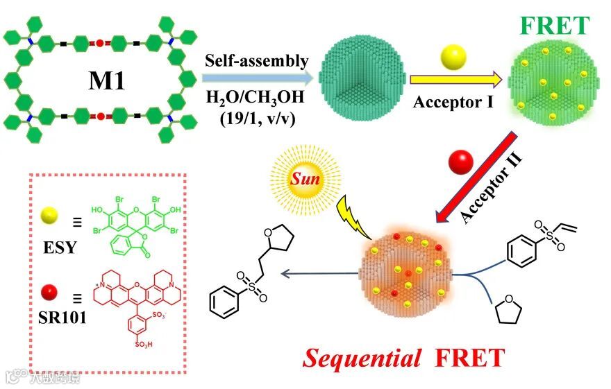 近期,东华大学的易涛教授、张灯青副教授课题组发展了基于铂(II)基大环自组装体系、具有连续能量转移过程的光捕获体系,并成功用于水体系中光催化苯基乙烯基砜和四氢呋喃的C-H键活化反应(图1)。