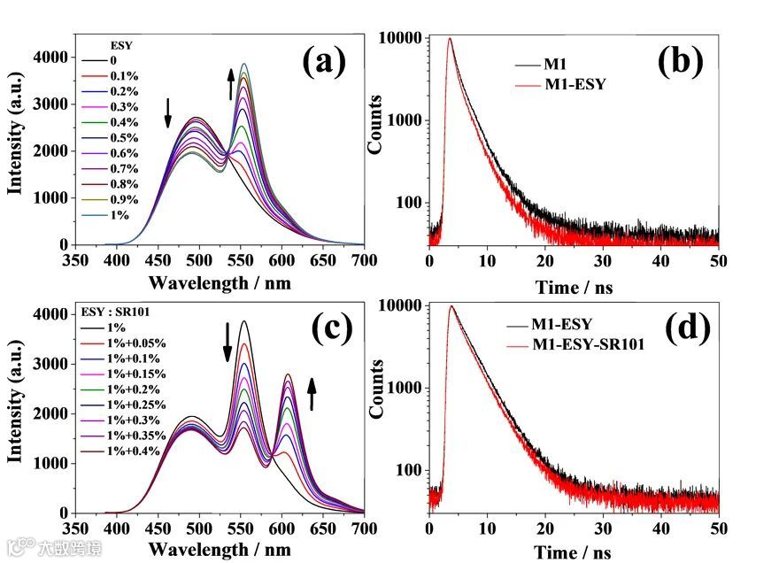 图2. (a)向M1中加入不同量的ESY的发射光谱变化图。(2)M1与M1-ESY(100:1)的荧光寿命衰变曲线。(3)向M1-ESY体系中加入不同量的SR101的发射光谱变化图。(4)M1-ESY与M1-ESY-SR101(500:5:4)的荧光寿命衰变曲线。