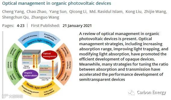 中国科学院曲胜春和中国科学院半导体研究所王智杰团队对有机光伏器件中的光学调控进行了总结。综述了有机光伏器件中的光学调控技术和光学调控策略,包括增加吸收范围,提高光子捕获,改变吸收和透过的比例以促进半透明器件性能的提升。