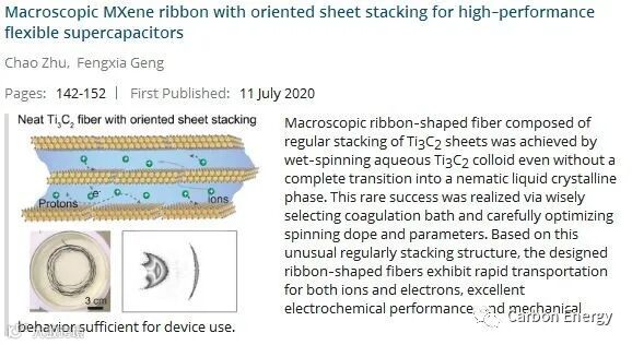 苏州大学能源学院耿凤霞教授团队通过优化Ti3C2纺丝液并调控纺丝工艺,成功将非液晶相二维Ti3C2组装成具有高度有序堆叠微观结构的宏观带状纤维;随后采用酸浸泡法去除层间絮凝剂同时在层间引入利于离子快速传输的电解液,获得了具有连续离子和电子传输网络的纯Ti3C2纤维。