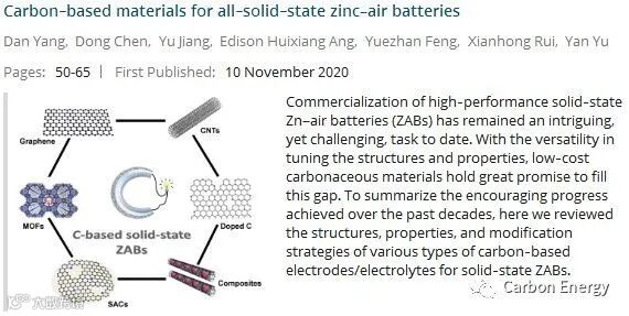 广东工业大学芮先宏教授和中国科学技术大学余彦教授团队系统阐述了目前固态锌空电池面临的挑战,以及碳基材料作为长效高活性催化电极的优势,并进一步对几种代表性碳基材料(如金属有机框架材料衍生物、单原子催化剂、石墨烯、碳纳米管、离子掺杂的碳材料、碳与氧化物/硫化物的复合物等)的性能与改性策略进行了详细探讨。