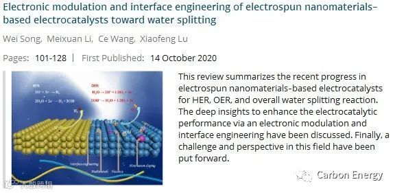 吉林大学卢晓峰课题组聚焦于静电纺丝材料的电子调制和界面设计在分解水中的应用。介绍了用于水分解反应的电催化剂设计,讨论了用于调节HER、OER和全解水性能的两种策略。重点介绍了静电纺丝纳米材料-基HER、OER和全解水电催化剂在电子和界面作用方面的最新进展。最后,提出了该发展领域中存在的挑战和未来的发展方向。