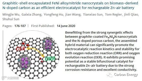 加拿大国立科学院能源材料所孙书会教授团队报道了利用生物质纤维素作为碳源,三聚氰胺作为氮源,铁盐和镍盐作为金属源,通过简单的无模板法设计了一种类石墨烯碳层(石墨烯铠甲)包覆的双金属FeNi合金/氮化物金属纳米颗粒高度分散到多孔碳基底上。首先预合成负载于碳基底上离散的金属碳氢化物作为煅烧前体,然后通过一步可控双热解(分别在氩气和氮气条件)方法得到高密度、小尺寸且被类石墨烯碳层保护的M@C/NC结构。这种石墨化铠甲策略极大地提高了催化材料的双功能催化活性(ΔE=0.67V)和抗氧化能力。利用合成的催化材料FexNiyN@C/NC作为高性能双功能氧催化剂应用于可充式锌空气电池时,获得了高功率密度(~350 mW cm-2)和优异的循环稳定性(400h)。同时和加拿大光源合作,利用同步辐射技术,揭示了双功能催化剂高活性和高稳定性的机理。该工作为开发复合双功能电催化剂提供了新的设计思路,同时推动了锌空气电池在各储能领域的实际应用。