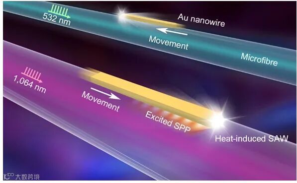 图1. 等离子驱动的Au 纳米线在二氧化硅微纳光纤运动示意图。展示了分别由波长为532 nm和1064 nm的脉冲激光驱动Au 纳米线在悬空微纳光纤上的运动。其中只有1064 nm的脉冲激光才能有效地激发Au 纳米线中的SPP,从而增强吸收光的热效应,并诱导产生表面声波驱动Au 纳米线沿二氧化硅微纳光纤运动。