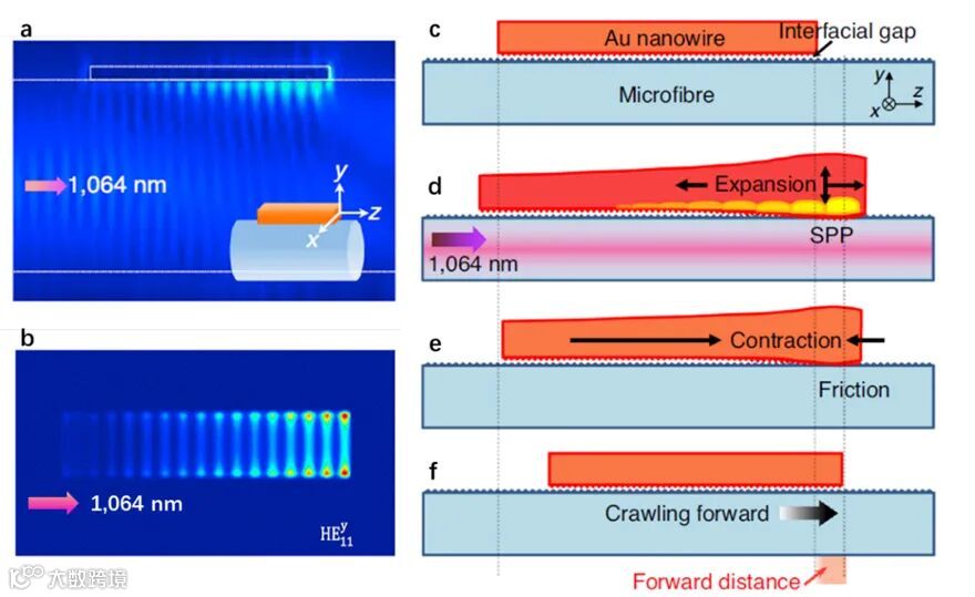 图2. 类蚯蚓蠕动运动机制示意图。(a)1064 nm脉冲激光通入微纳光纤与金纳米线作用的纵断面电场分布数值模拟结果。(b)图a中纳米线下表面的热场分布数值模拟图。(c-f)类蚯蚓蠕动运动机制的阶段示意图。