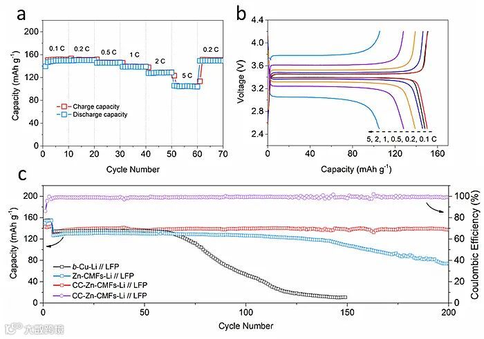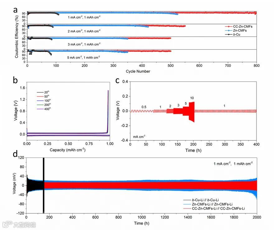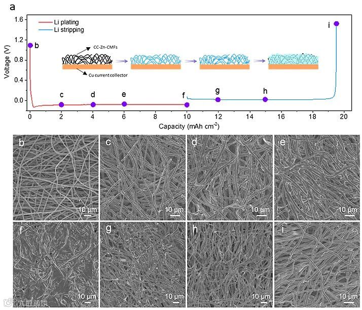 图3. 金属锂在CC-Zn-CMFs电极上的沉积行为研究。