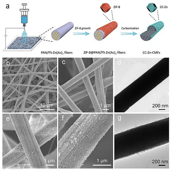 图1.(a)CC-Zn-CMFs三维多通道纤维的合成过程示意图。(b-g)扫描和透射电镜表征:(b-d)PAN/PS-Zn(Ac)2纤维,(e-g)ZIF‐8@PAN/PS‐Zn(Ac)2纤维。