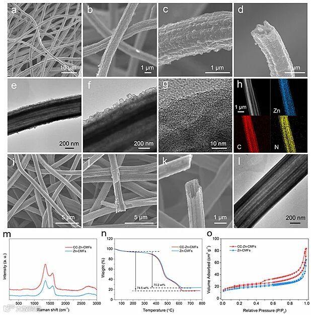 图2.(a-l)扫描和透射电镜表征:(a-h)CC-Zn-CMFs,(i-l)Zn-CMFs。CC-Zn-CMFs和Zn-CMFs的(m)拉曼光谱,(n)热重曲线,(o)N2吸脱附曲线。