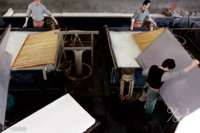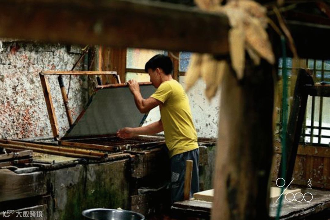 这众多的工序中,又以 “抄纸”最令人惊奇,也是最考验真功夫所在。纸浆随水流快速而下,师傅晃动着比双臂还宽大的木框,俗称“荡浆”。液状的纸浆在摆荡中,纤维于竹帘网格里交织重组,新生为一张张柔中带韧的纸材。