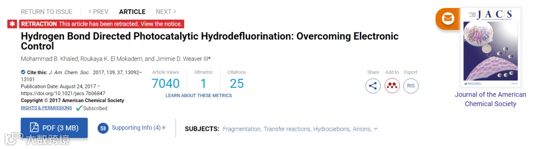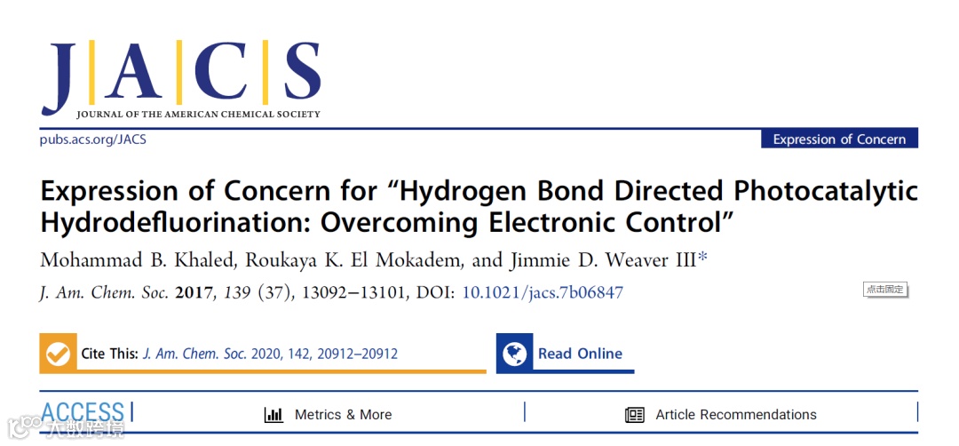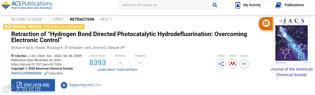 JACS作为化学领域学术期刊的“领头羊”, 以刊载基础化学和分子科学领域最高水平,最具原创新的研究成果而享有盛誉,一直是做化学相关研究小伙伴心中的“白月光”。然而,到了年终岁末的11月20日,一篇标题为“Retraction of ‘Hydrogen Bond Directed Photocatalytic Hydrodefluorination: Overcoming Electronic Control’” 的撤稿声明霍然刊载于JACS上,阅读量高达8000多,显得格外引人注目(图 1)。
