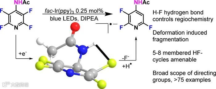 在这篇文章中,俄克拉荷马州立大学化学系的Jimmie D. Weaver III 教授团队报道了一种能够克服电子控制,由氢键导向的光催化高氟芳烃脱氟机制。