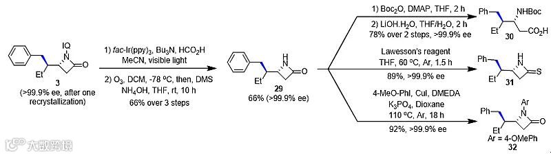 如图3所示,产物3可以在条件A下实现克级规模制备(60% yield, 97:3 er)。经过一次重结晶,产物3光学纯度可以达到大于99.9% ee。IQ导向基团也可以高效脱除得到产物29。化合物29经由Boc活化、LiOH水解可以得到手性β-氨基酸类衍生物30。化合物29与Lawesson试剂反应,可以高效得到手性β-硫代内酰胺类化合物31。此外,化合物29还可以在铜催化下实现高效的N-芳基化反应得到产物32。产物30-32的绝对构型均保持一致。