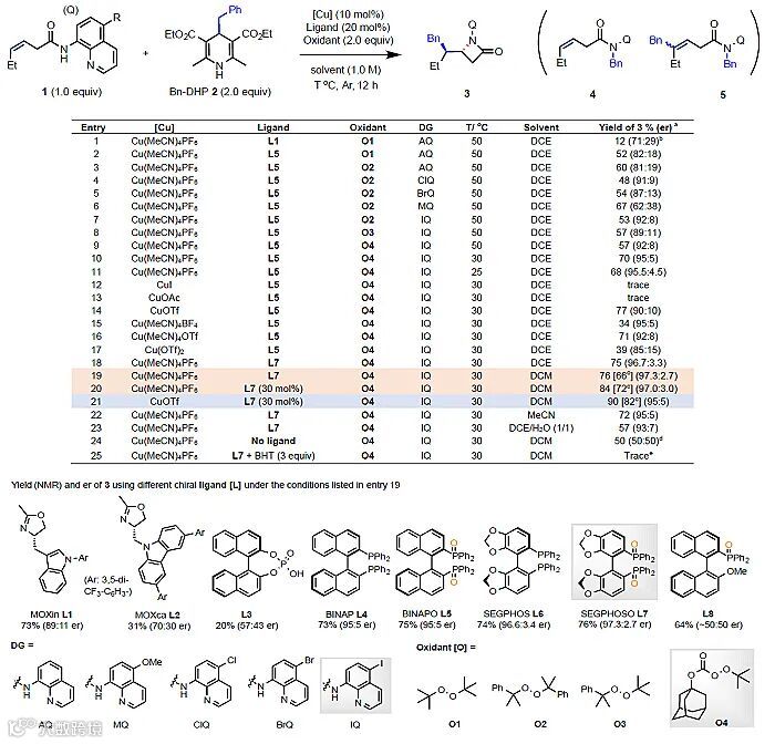 如表1所示,作者首先选用N-喹啉(AQ)取代的顺3-己烯酰胺(1')作为模板底物、Bn-DHP作为烷基化试剂、Cu(MeCN)4PF6作为催化剂、DTBP (O1) 作为氧化剂,与之前报道的MOXin配体L1相结合,以71:29 er得到了手性β-内酰胺类化合物3'(entry 1)。然而,继续优化其他的MOX配体(例如MOXca: L2)以及BOX等配体均无法实现更高的对映选择性。有趣的是,当使用BINAPO配体 (L5)时,反应活性和对映选择性均有较好的提高(52% yield, 82:18 er, entry 2)。相比之下使用BINAP (L4)却只能得到微量的产物3。氧化剂O2对收率略有促进 (entry 3)。在喹啉导向基团C8位引入碘原子可以将er提升至92:8 (IQ, entries 4-7)。受刘心元团队工作的启发(Angew. Chem., Int. Ed., 2020, 59, 1129),当使用O4氧化剂时,可以降低反应温度至室温,并且可以达到70% yield, 95:5 er (entries 9-11)。最终,使用基于SEGPHOSO骨架的膦配体氧化物L7,在DCM溶剂中可以得到最优结果:76% yield, 97.3:2.7 er (entry 19)。对于反应条件其他值得强调的有:(1)不加配体会得到一定量的N-烷基化副产物4 (16%)和双烷基化副产物5(32%)(entry 24);(2)当使用O4氧化剂时,双膦配体L6与其氧化物L7效果相当,因为在该条件下L6迅速被氧化为L7(3小时内可全部氧化);(3)当使用O1或O2作为氧化剂时,双膦配体L6只能得到微量的产物(同时伴随少量的L7生成);(4)在体系中加入3当量的二丁基羟基甲苯(BHT)可以抑制该反应的发生,以42%收率得到Bn-BHT加合物6(entry 25),说明该反应可能经由自由基过程进行。